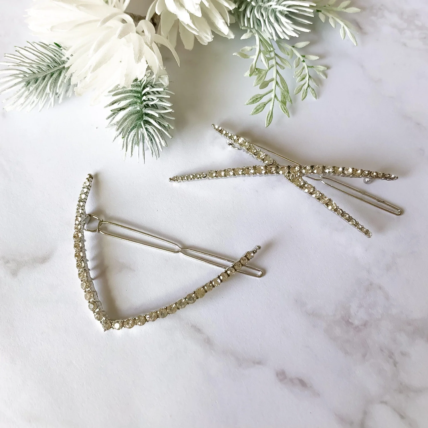 - Sparkly rhinestone hair clips add a romantic glam to your hair in a "V" check or X design.