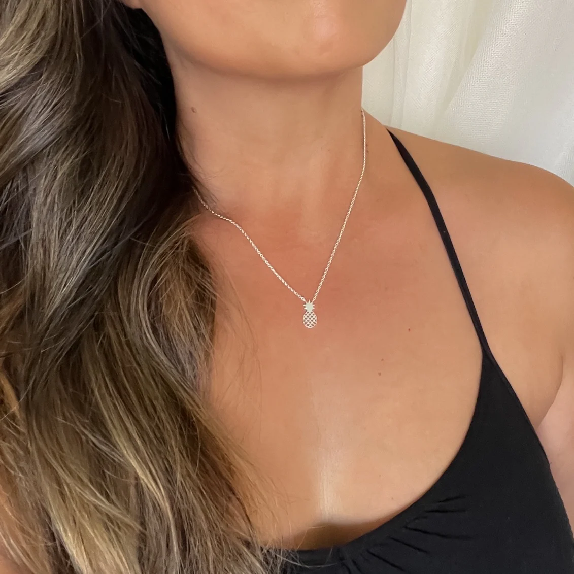 - Take home a pineapple and the tropical vacation vibe along with it! Small, dainty, and cute, this necklace will fit like a loose choker or a short necklace (about 14in + 2.5 in extension).